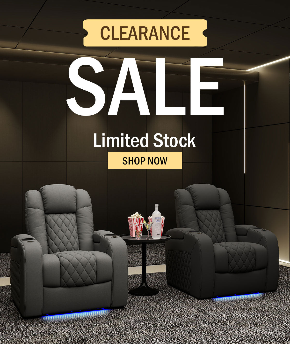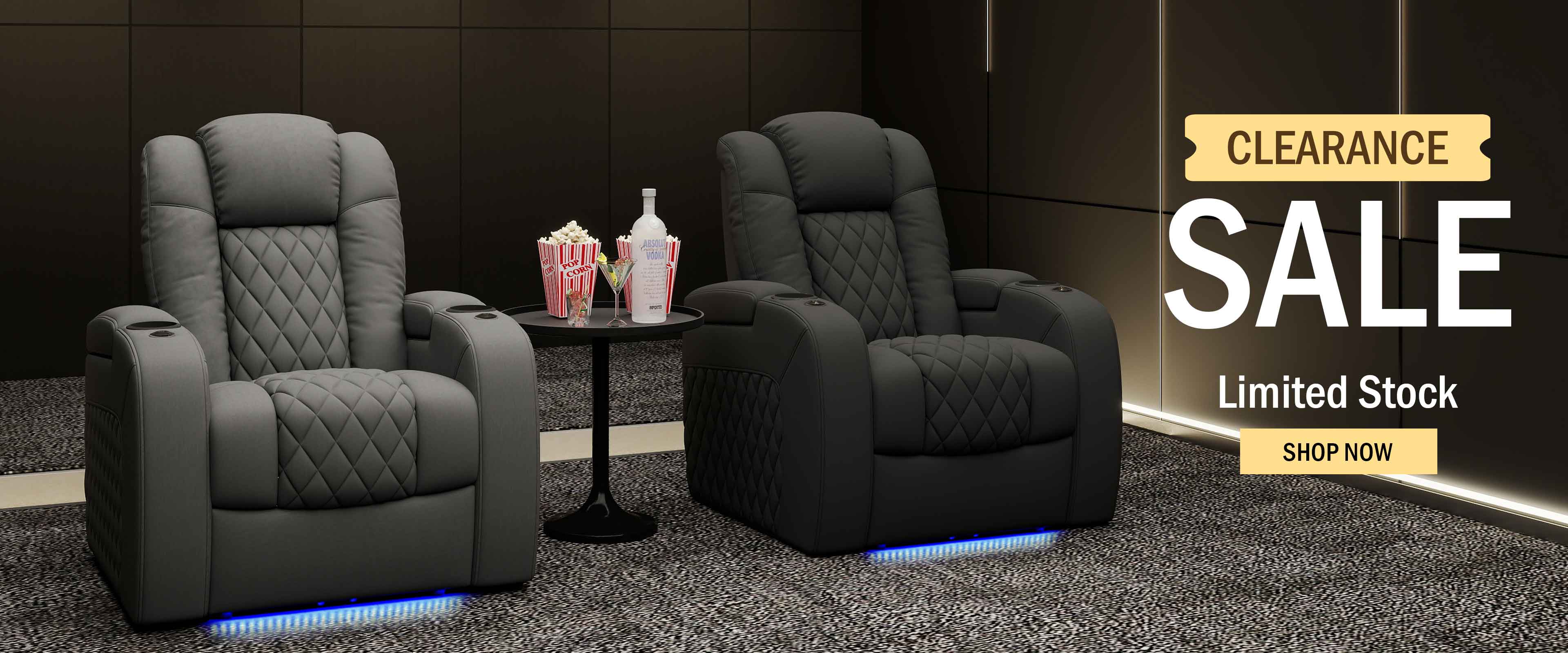 The clearance promotion runs while supplies last. Inventory is limited, and once sold out, these discounted reclining theater chairs will not be restocked at clearance prices.