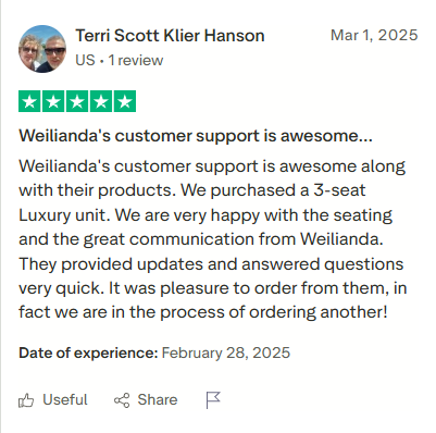 Weilianda astronaut theater chairs are absolutely awesome. Communication is great with the company and they were delivered on time. I am getting nothing but compliments on the chairs. There are great value I would recommend them.