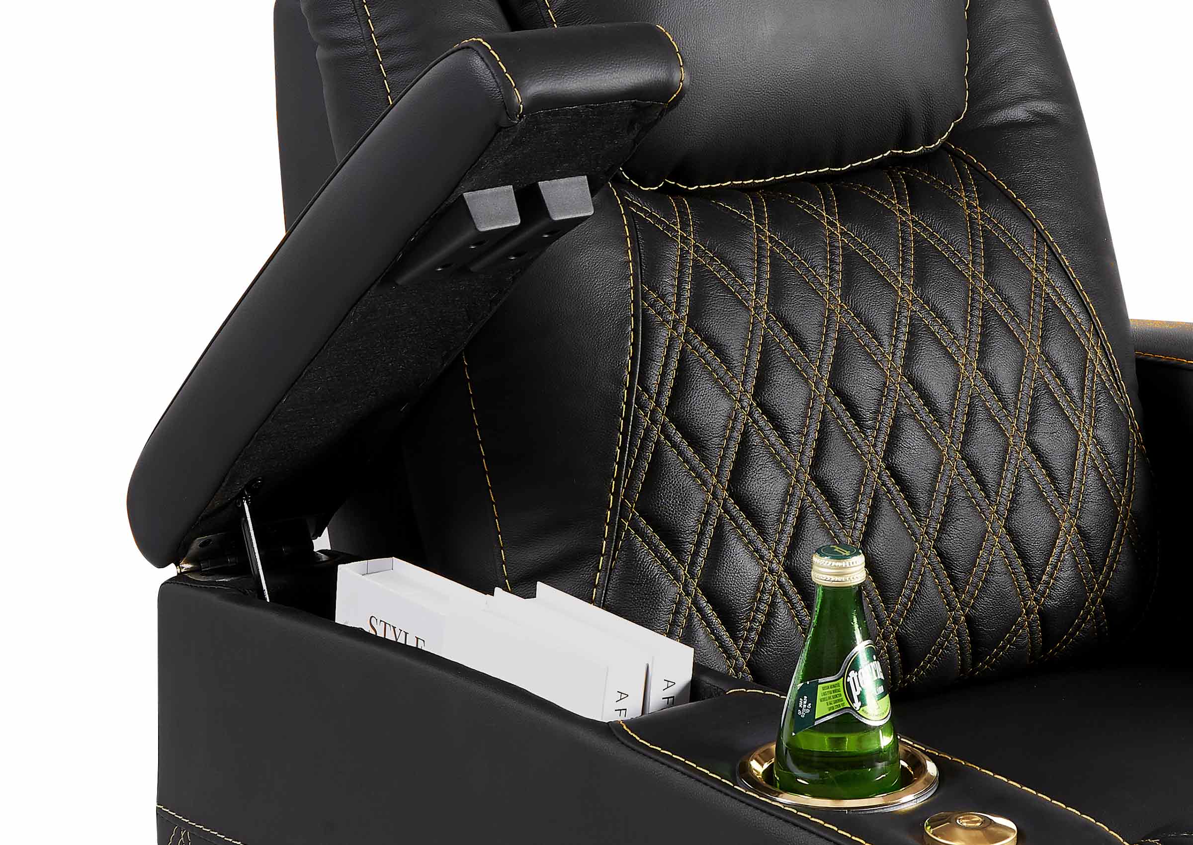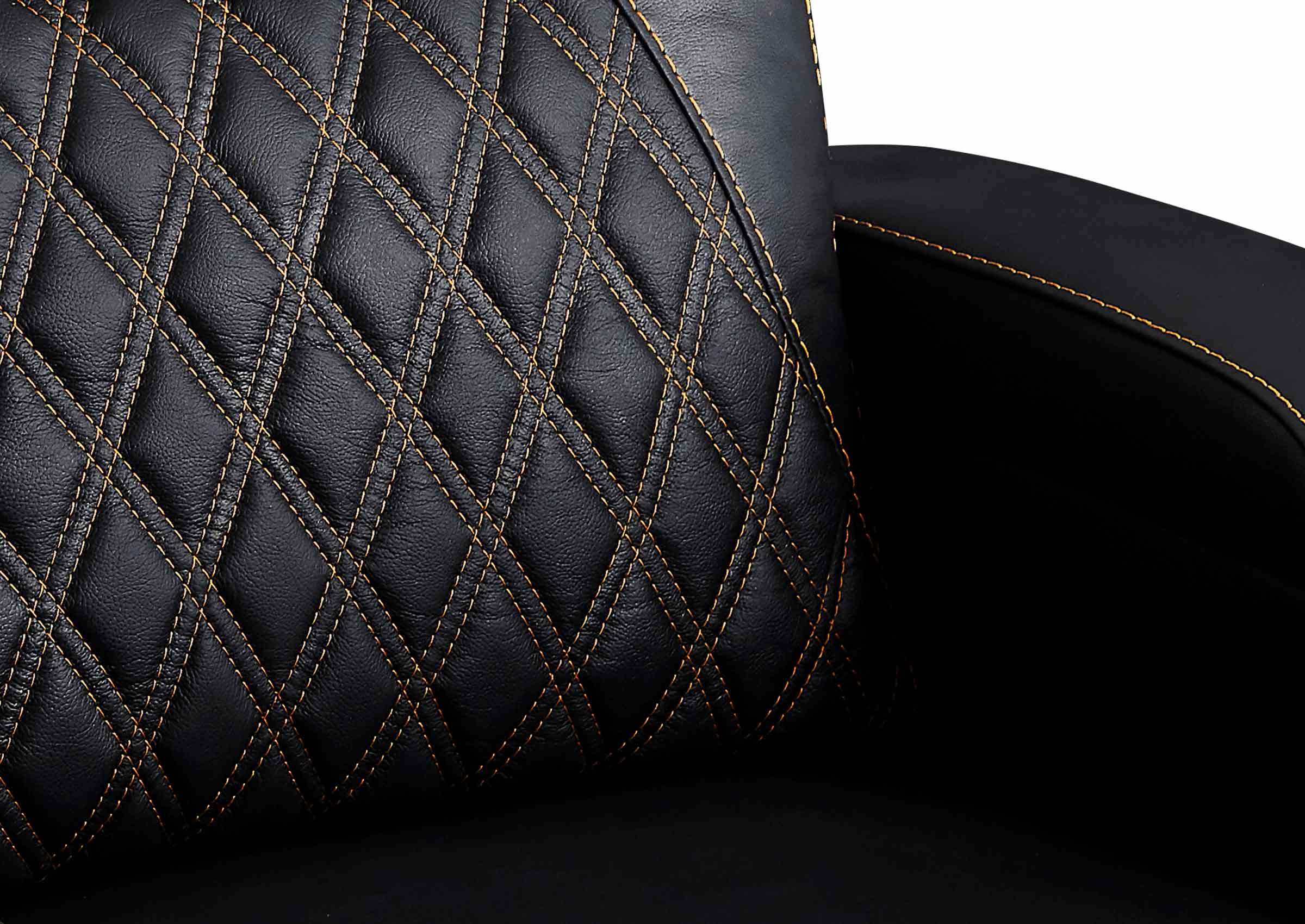We have specially designed this Chic seris sofa with carbon fibre patterned tray table, 7 Color Ambient Lighting, gold stitching.