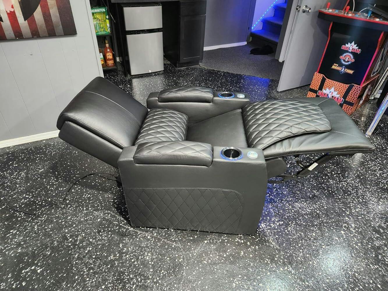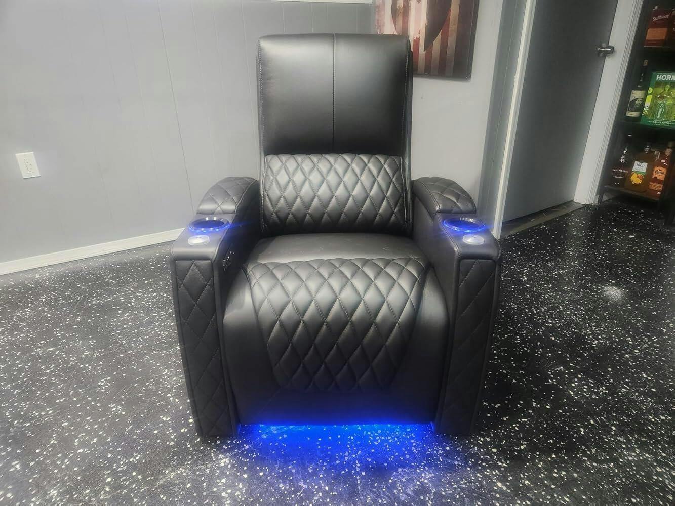 Each armrest has a removable cup holder. It also comes with switchable blue ambient lighting. Giving you an easy way to find your drink or cup during a film marathon or game night.