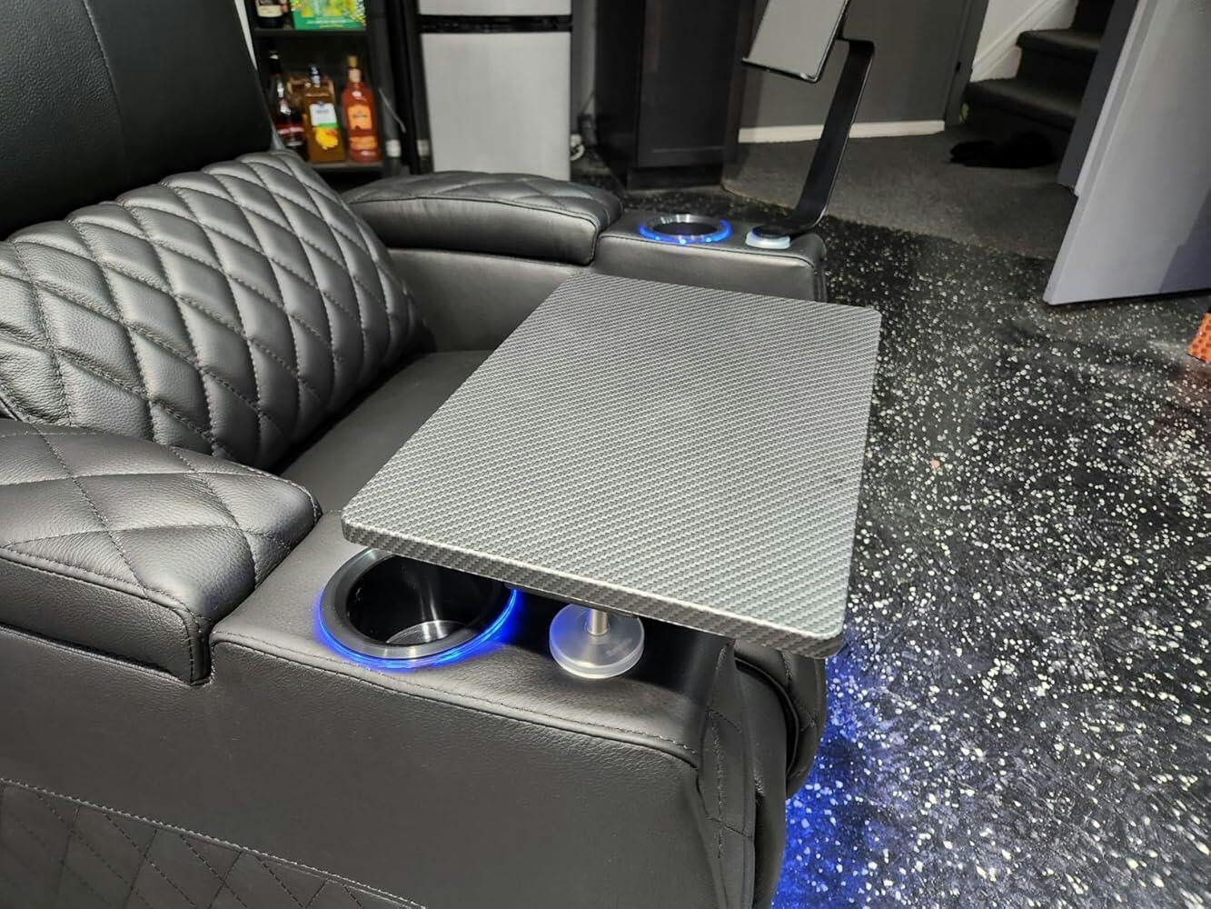 Each seat in the Astronaut Series comes with a tray table and a tablet holder. Wine glass holders are not included but can be purchased separately to enhance your viewing experience.