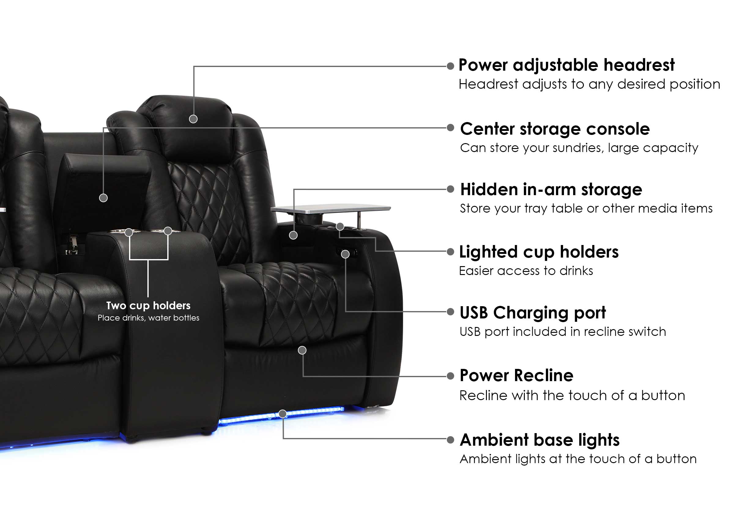 Take your movie-going experience to the next level with our amazing theater seating. We've specially designed this Luxury Series sofa with built-in storage, cup holders, tray table, ambient lighting and more.