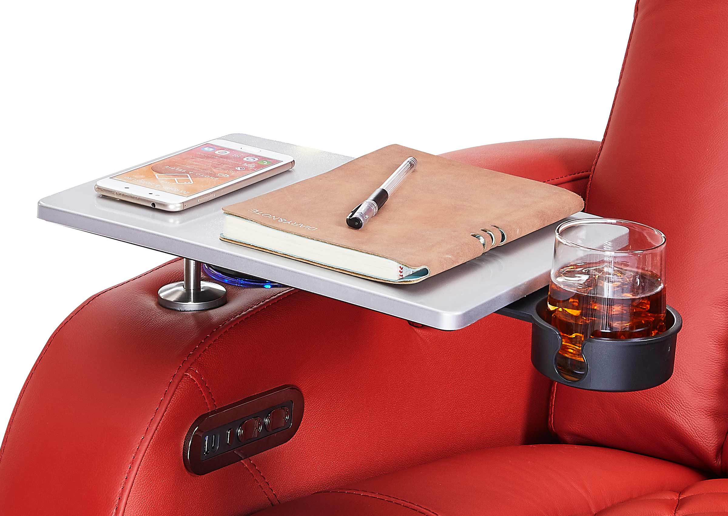 Swivel tray table plugs into the arm of the chairs, perfect for placing snacks while watching a movie. Use a laptop or book while reading.