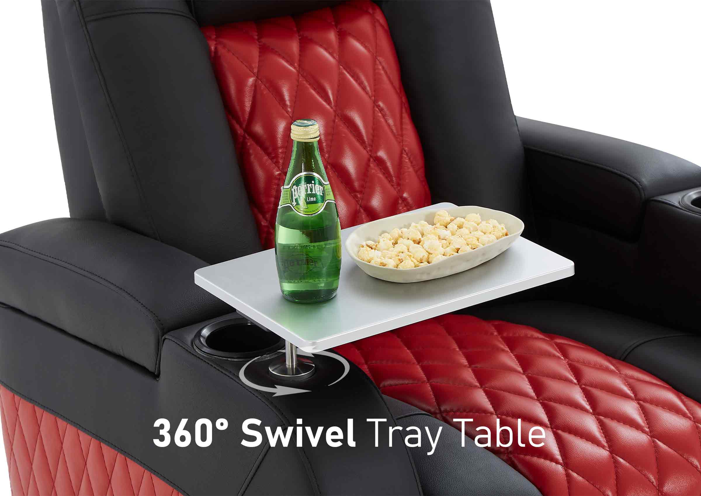 Swivel tray table plugs into the arm of the chairs, perfect for placing snacks while watching a movie. Use a laptop or book while reading.