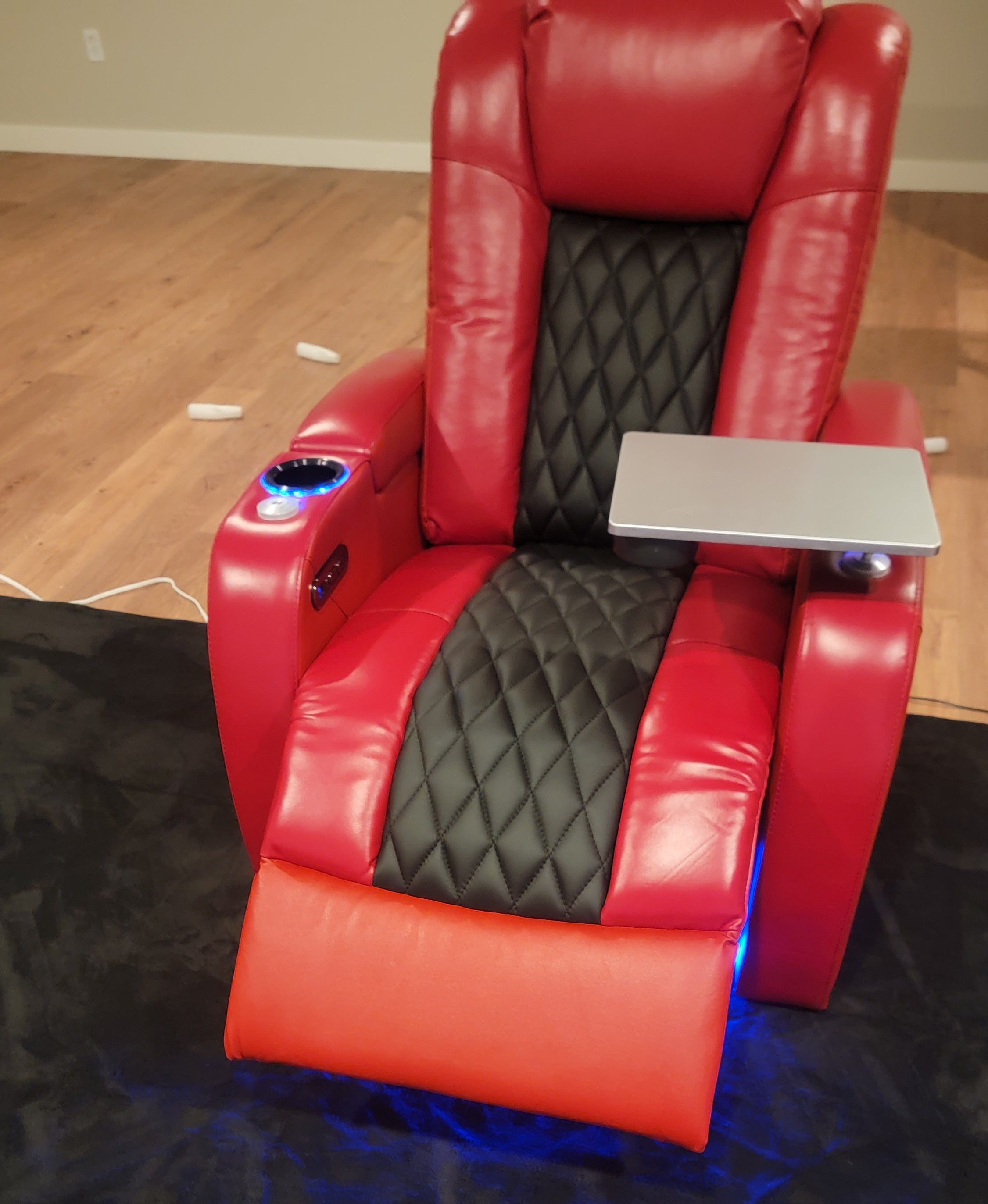 Swivel tray table plugs into the arm of the chairs, perfect for placing snacks while watching a movie. Use a laptop or book while reading.