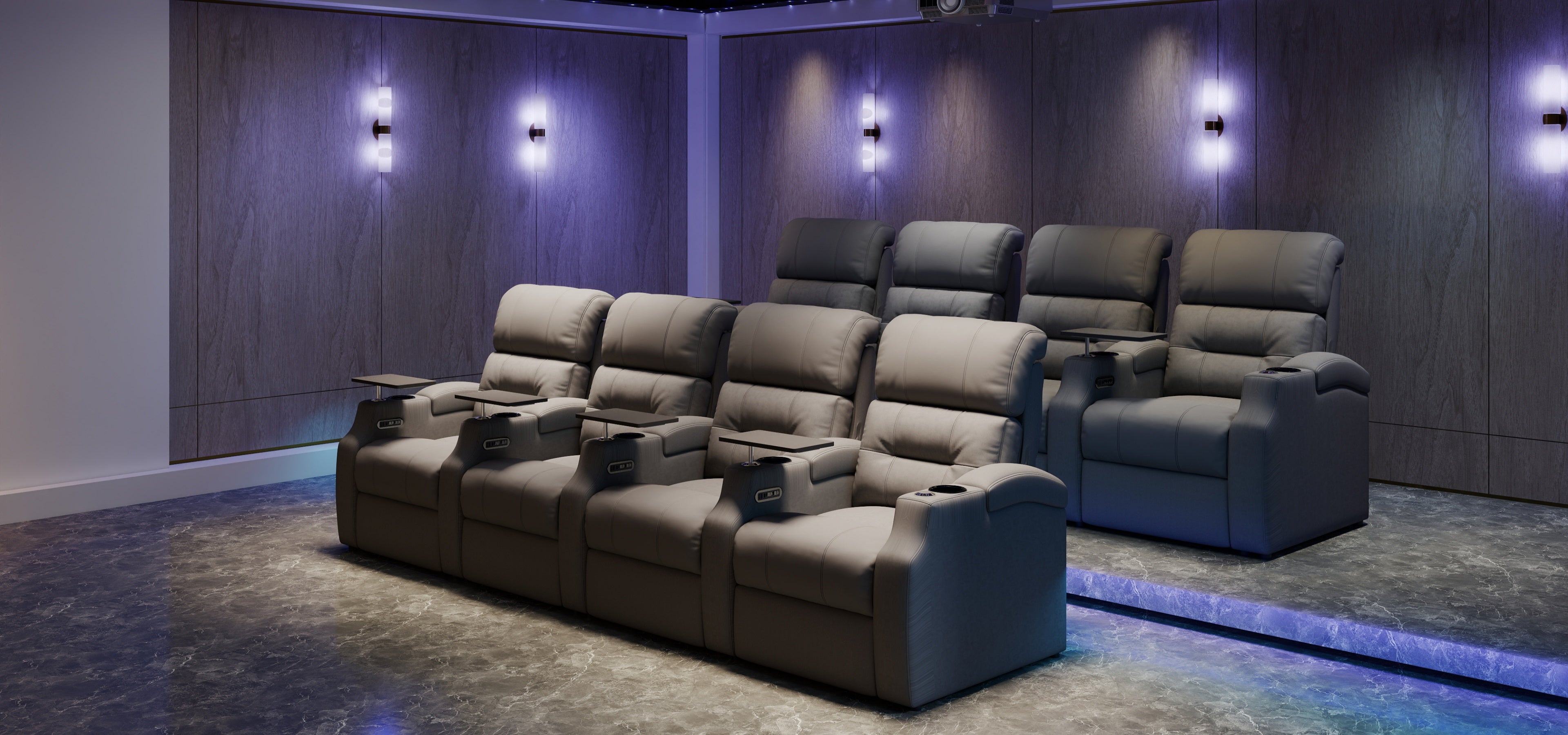 Each seat comes with a tray table. Wine glass holder and tablet holder are not included but can be purchased separately to enhance your viewing experience.